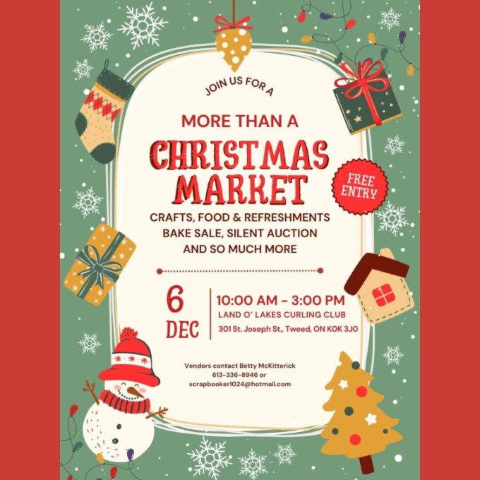 Get ready for the Land O’ Lakes Curling Club’s ‘More Than A Xmas Market‘. Crafts, food and refreshments, bake sale, silent auction and more. Part of the community Christmas events Dec. 3-7, including the parade on Sat. Dec. 6 at 12:30!