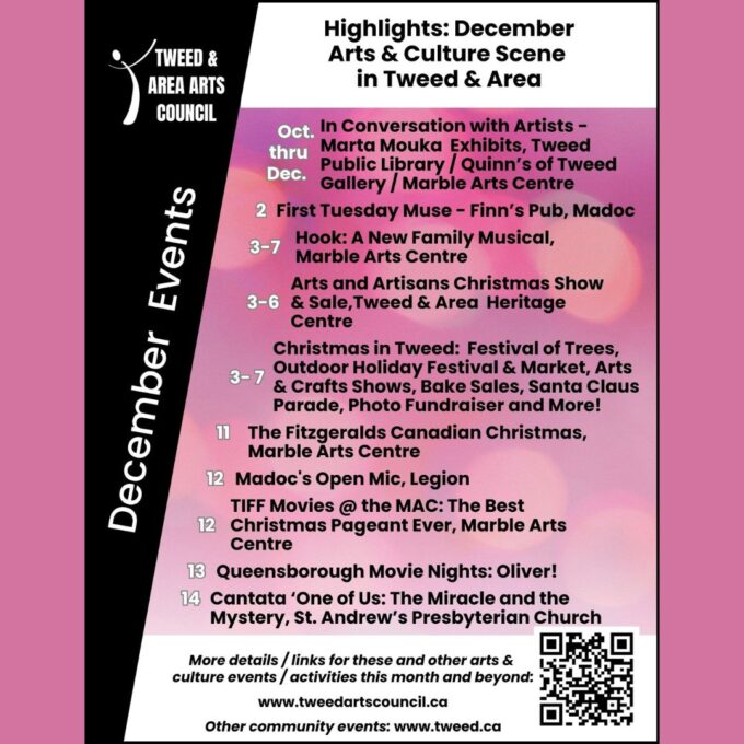 The Tweed & Area Arts Council has been working with several other local organizations to share information / coordinate the many arts / culture events happening in our community. One of the products we have prepared to help get the word out is a monthly poster calendar that highlights Tweed arts and culture events. This one is for December 2025 – please share the pdf or jpeg version! For more details on these and other events, and to learn about additional arts events in Tweed, see our events listing ! Please feel free to submit your arts or culture event to us so we can add it to the calendar. Please note that if you have questions or comments about events, contact the host organization directly via the ‘Learn More’ button on each of the individual listings in our events page.