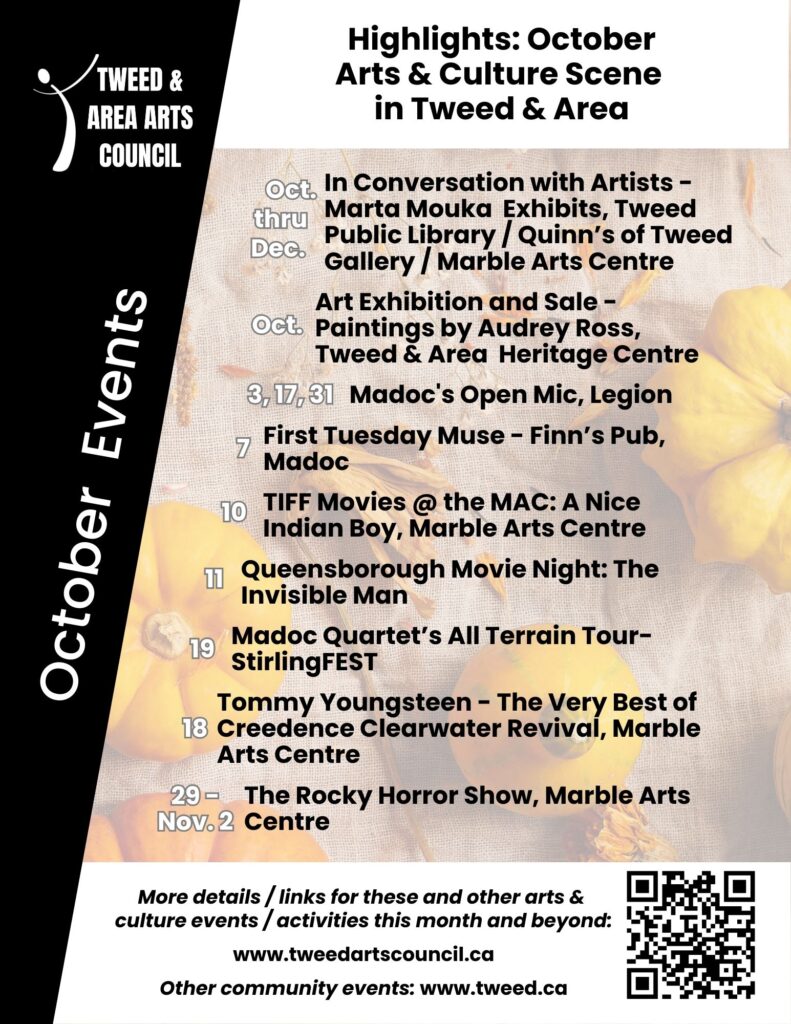 The Tweed & Area Arts Council has been working with several other local organizations to share information / coordinate the many arts / culture events happening in our community. One of the products we have prepared to help get the word out is a monthly poster calendar that highlights Tweed arts and culture events. This one is for October 2025 – please share the pdf or jpeg version! For more details on these and other events, and to learn about additional arts events in Tweed, see our events listing ! Please feel free to submit your arts or culture event to us so we can add it to the calendar. Please note that if you have questions or comments about events, contact the host organization directly via the ‘Learn More’ button on each of the individual listings in our events page.