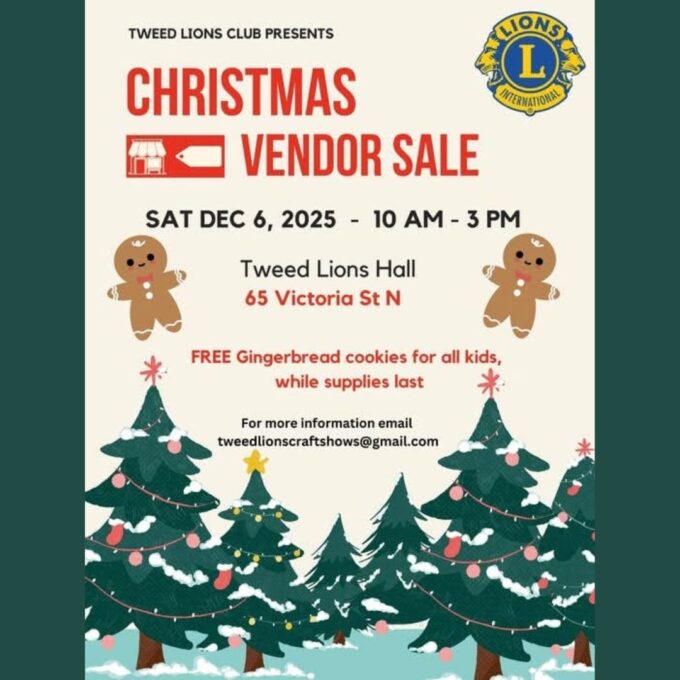 The Tweed Lions present their annual Christmas show and sale, lots of handmade items – visit at the Tweed Lions Hall. If you are interested in a spot please email tweedlionscraftshows@gmail.com for more information. Part of the community Christmas events Dec. 3-7, including the parade Sat. Dec. 6 at 12:30!