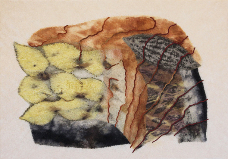 Marta Mouka is a textile artist who creates collages using a unique approach to needle felting. She works with woven silk, often eco-printed with plant material, to make finished textiles with a smooth texture and soft-focus colour transitions. She experiments with centuries-old techniques of dyeing with natural dyes and combines them with the more contemporary method of botanical printing. She also creates eco-printed silk scarves. Marta has planted trees and flowers on her property to use in her work.